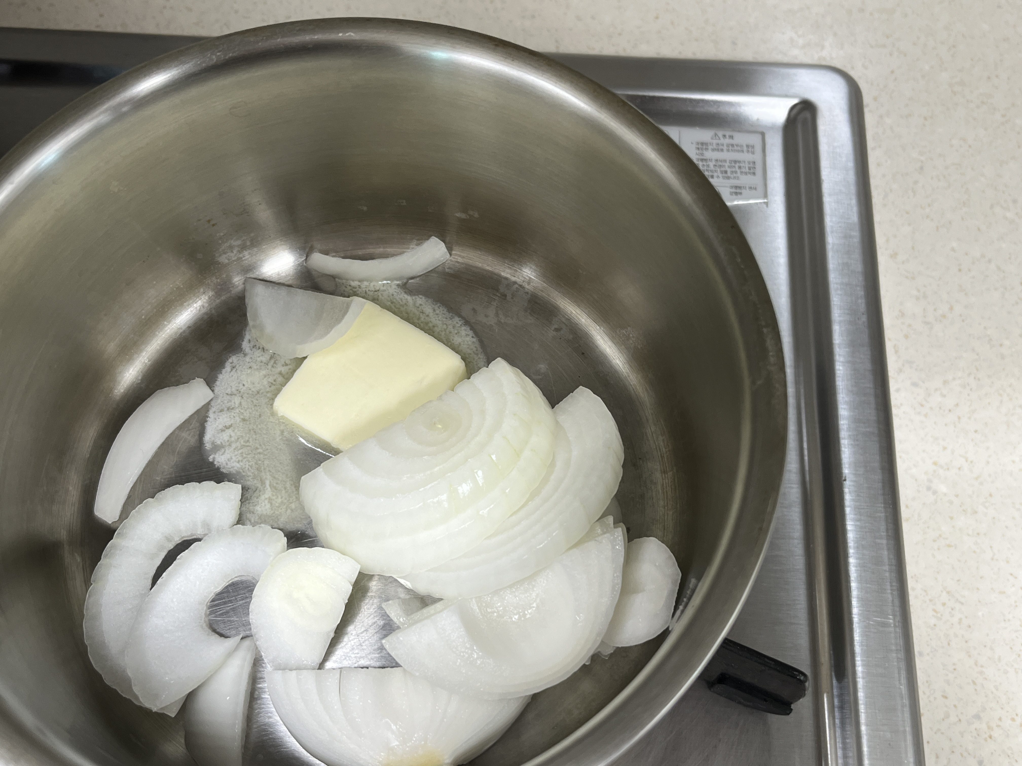냄비에 버터 15g과 채 썬 양파를 함께 넣어 달달 볶아 줍니다. 중불에서 양파가 노릇해질 때까지 볶아 줍니다. 양파가 노릇하게 볶아져야 맛있는 감자 수프가 완성됩니다.