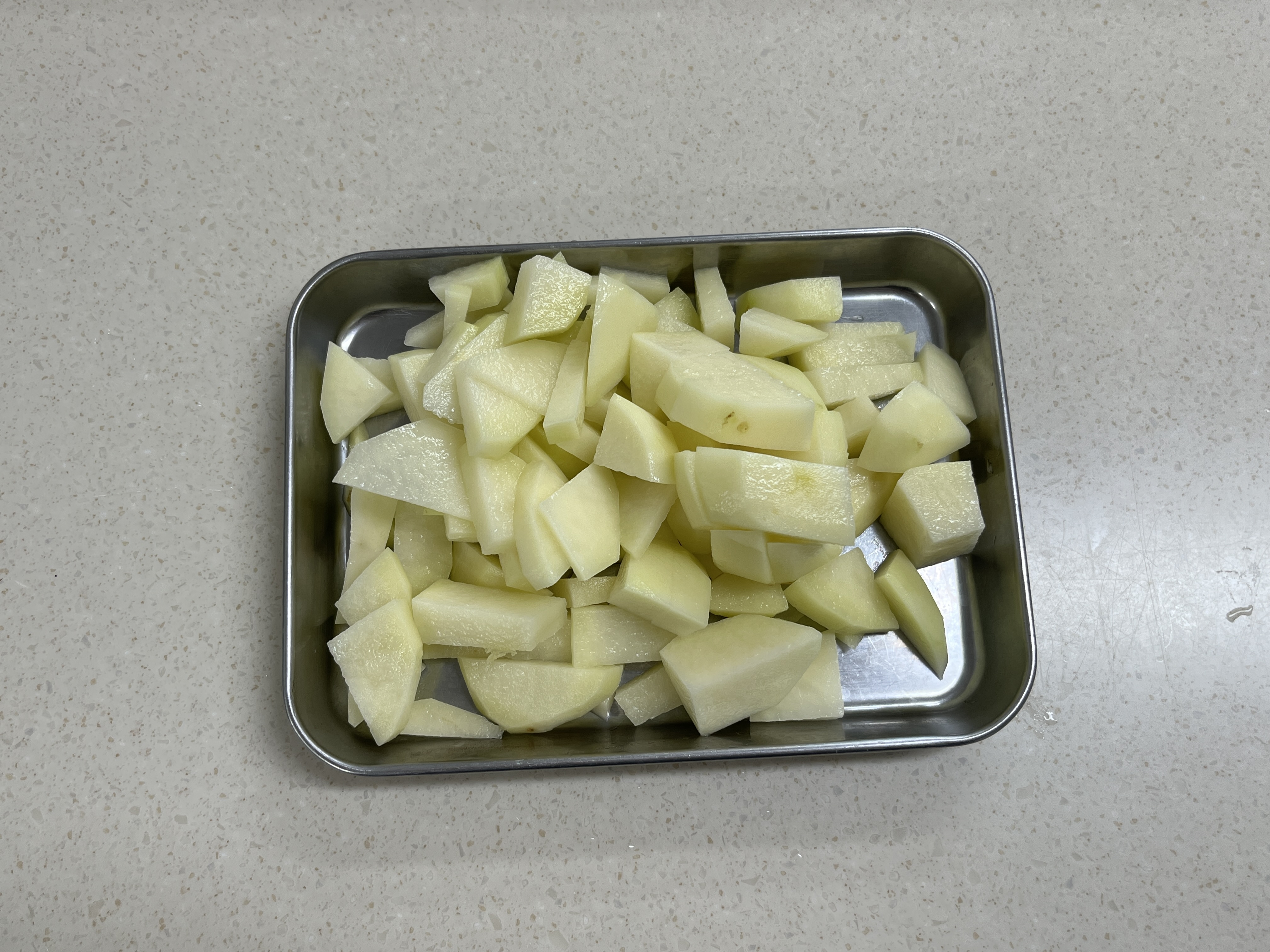 감자 2개는 작은 크기로 잘라줍니다. 작은 크기로 잘라야지 감자 익는 시간이 줄어듭니다. 양파 1/2개는 채를 썰어서 준비하여 줍니다.