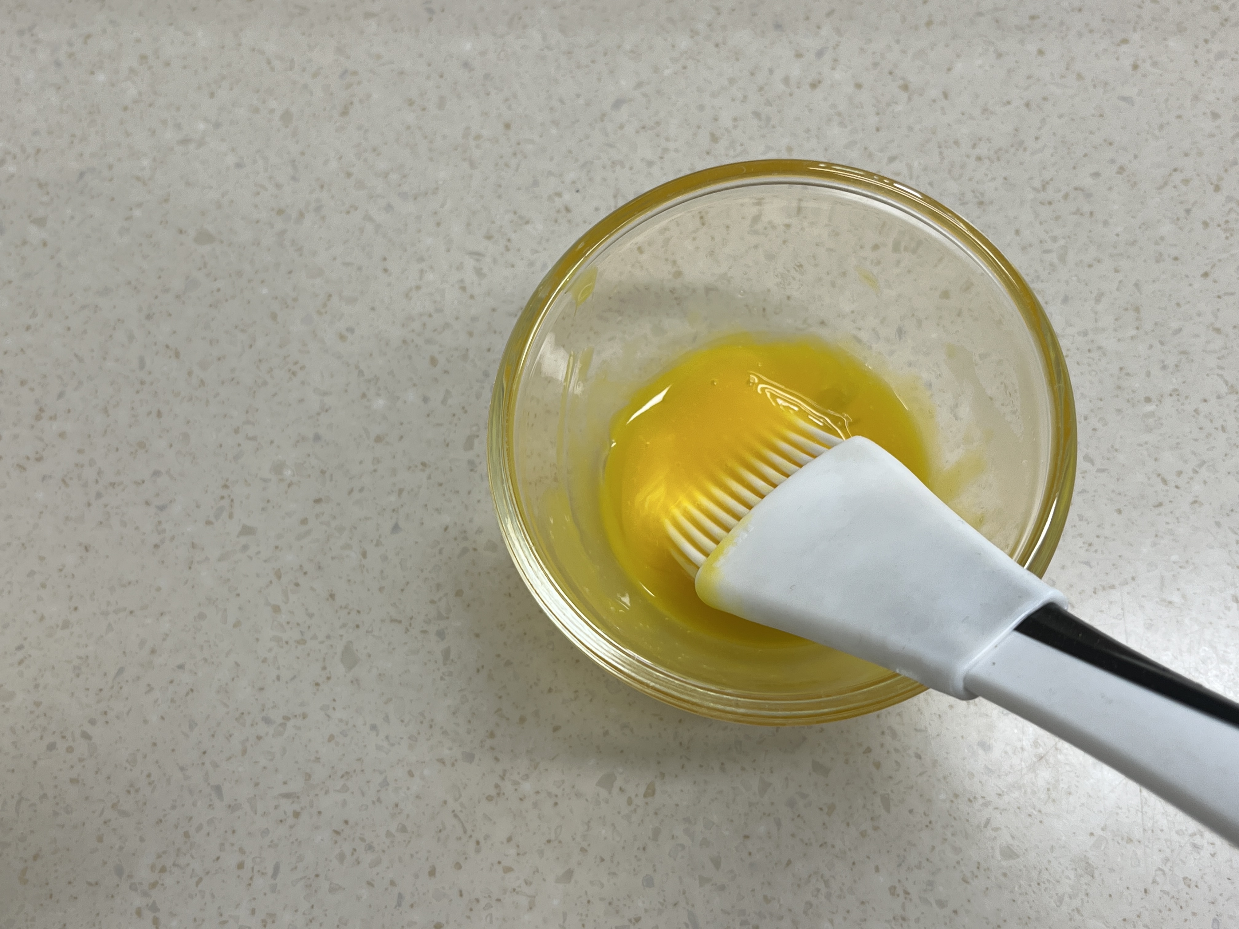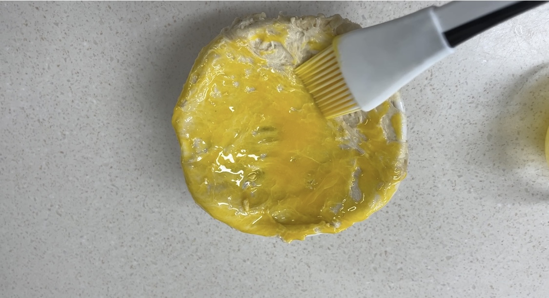 솔을 사용하여 노른자를 풀어서 쓱쓱 발라줍니다. 이때 노른자 너무 많이 바르지 마세요. 많이 발랐더니 금방 탔습니다. 이렇게 발라서 에어프라이어 또는 오븐에서 170도로 10 ~15분 가량 굽습니다.