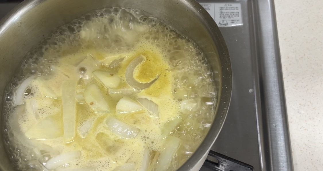 양파가 노릇해지면 작은 크기로 잘라 준 감자를 넣어 함께 익혀줍니다. 감자를 넣어 익힐 때 치킨 스톡 큐브 반을 넣고 물을 넣어 감자가 포슬포슬하게 익혀 줍니다.