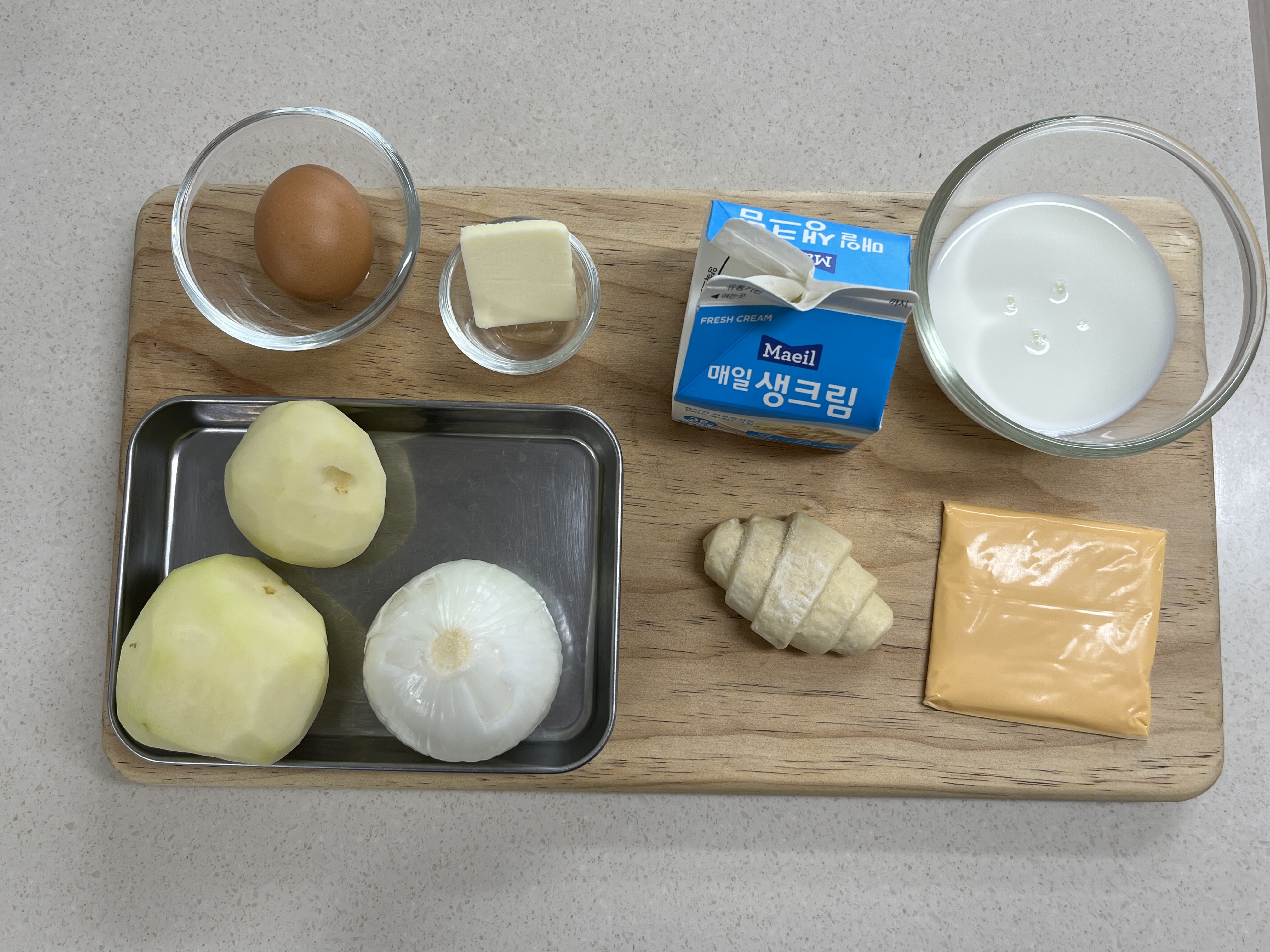 오늘의 재료를 준비하여 줍니다. 감자는 2개를 사용하였더니 2인분의 감자 수프가 만들어졌습니다. 크루아상 생지는 수프 위에 올릴 예정이어서 사용하였습니다. 여기에서 치즈는 사용하지 않았습니다. 치킨스톡을 넣었더니 간이 조금 강한 거 같아 생략하였습니다.