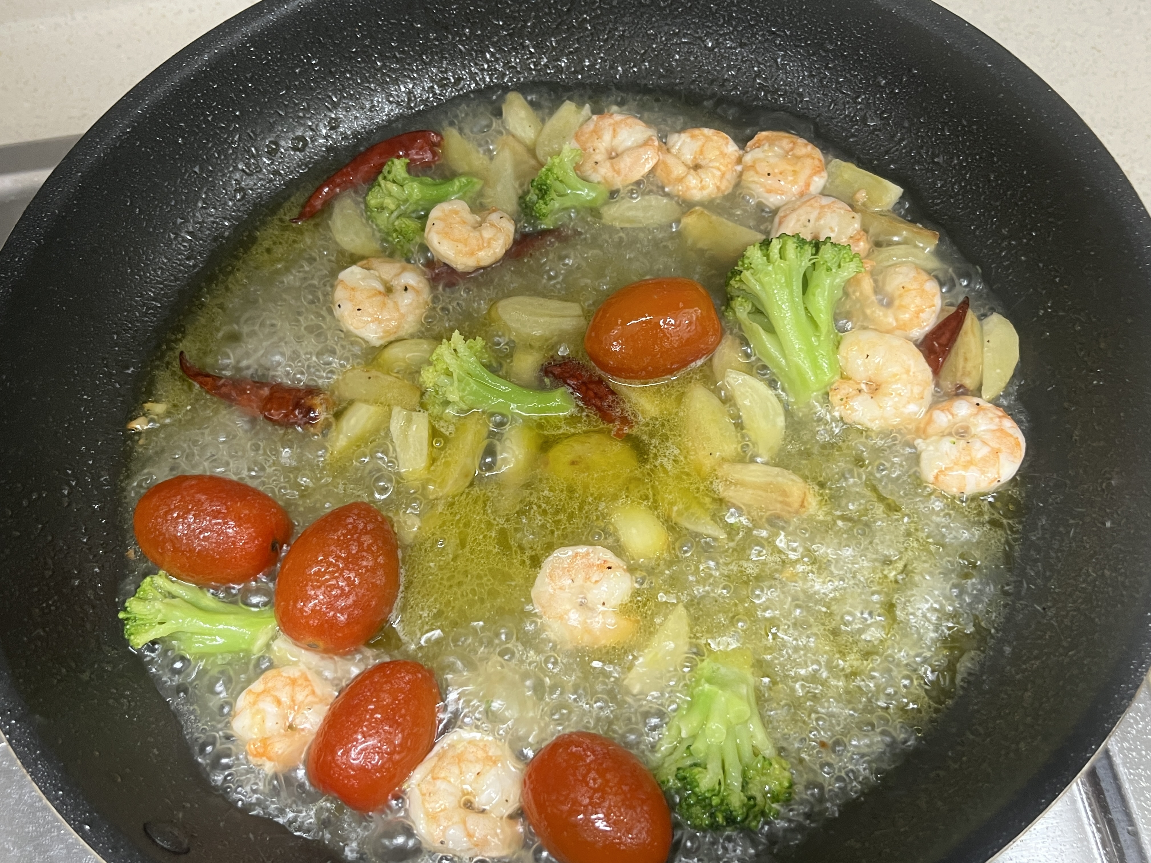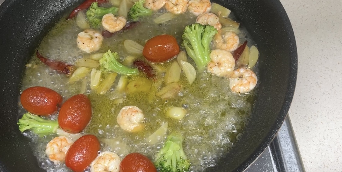 페페론치노를 넣어 함께 볶다가 새우를 넣어 함께 볶아줍니다. 올리브오일을 더 넣어 주었으며, 면수도 조금 부어 함께 볶아주었습니다. 밑간 한 새우를 넣어 함께 튀기듯이 볶아 줍니다. 아직 재료들을 더 넣어 줄 예정이어서 불은 중불로 하여 주시면 됩니다.