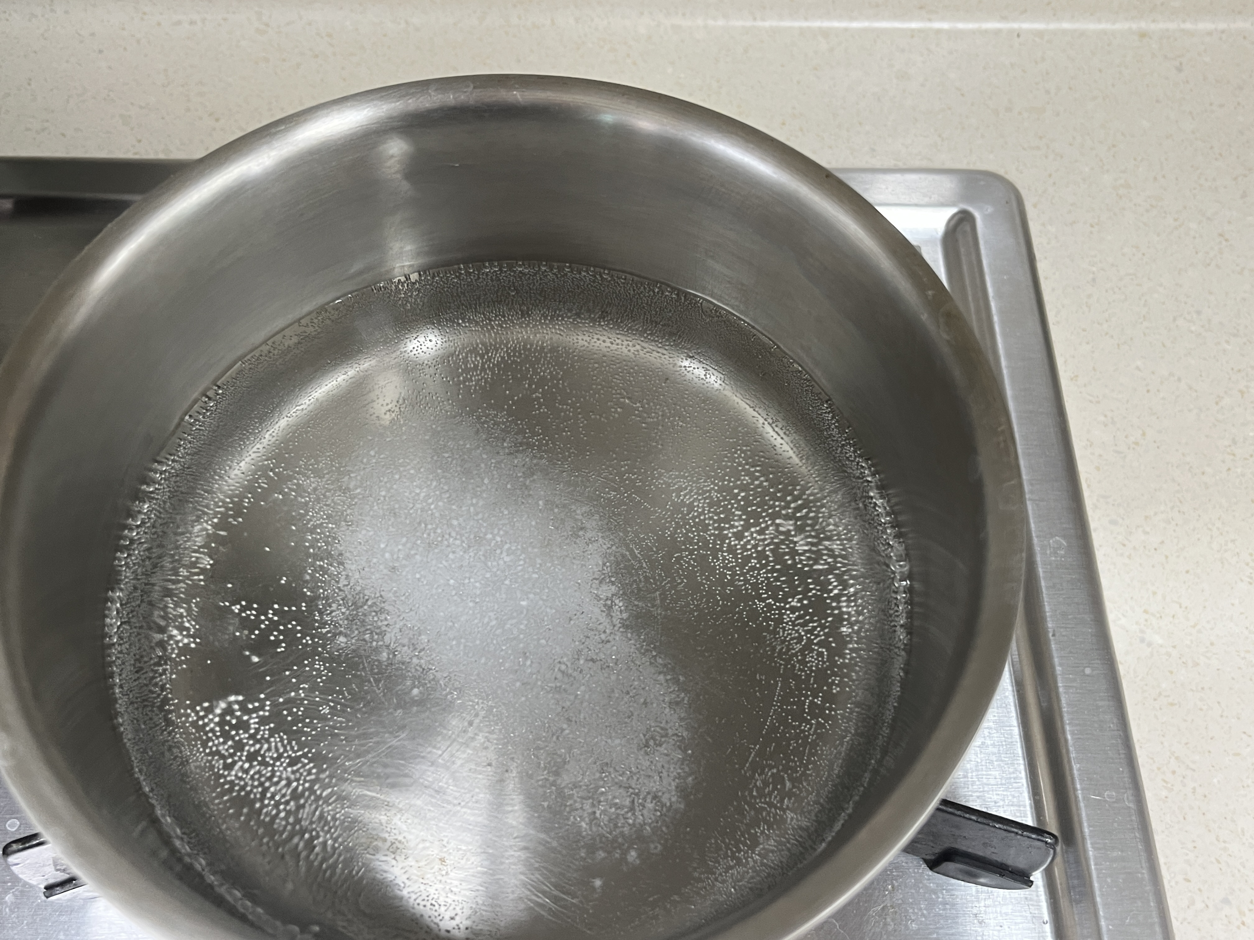 재료를 준비하는 동안 감바스와 함께 곁들일 파스타면을 삶아 줍니다. 파스타 면은 60g 준비하였습니다. 냄비에 물과 소금 1T를 담고 물이 끓으면 파스타 면을 넣어 센 불에서 6분 30초 삶아 줍니다. 불의 화력이나 양에 따라 파스타 면 삶는 시간은 다르기 때문에 시간 조절하여 주시면 됩니다.