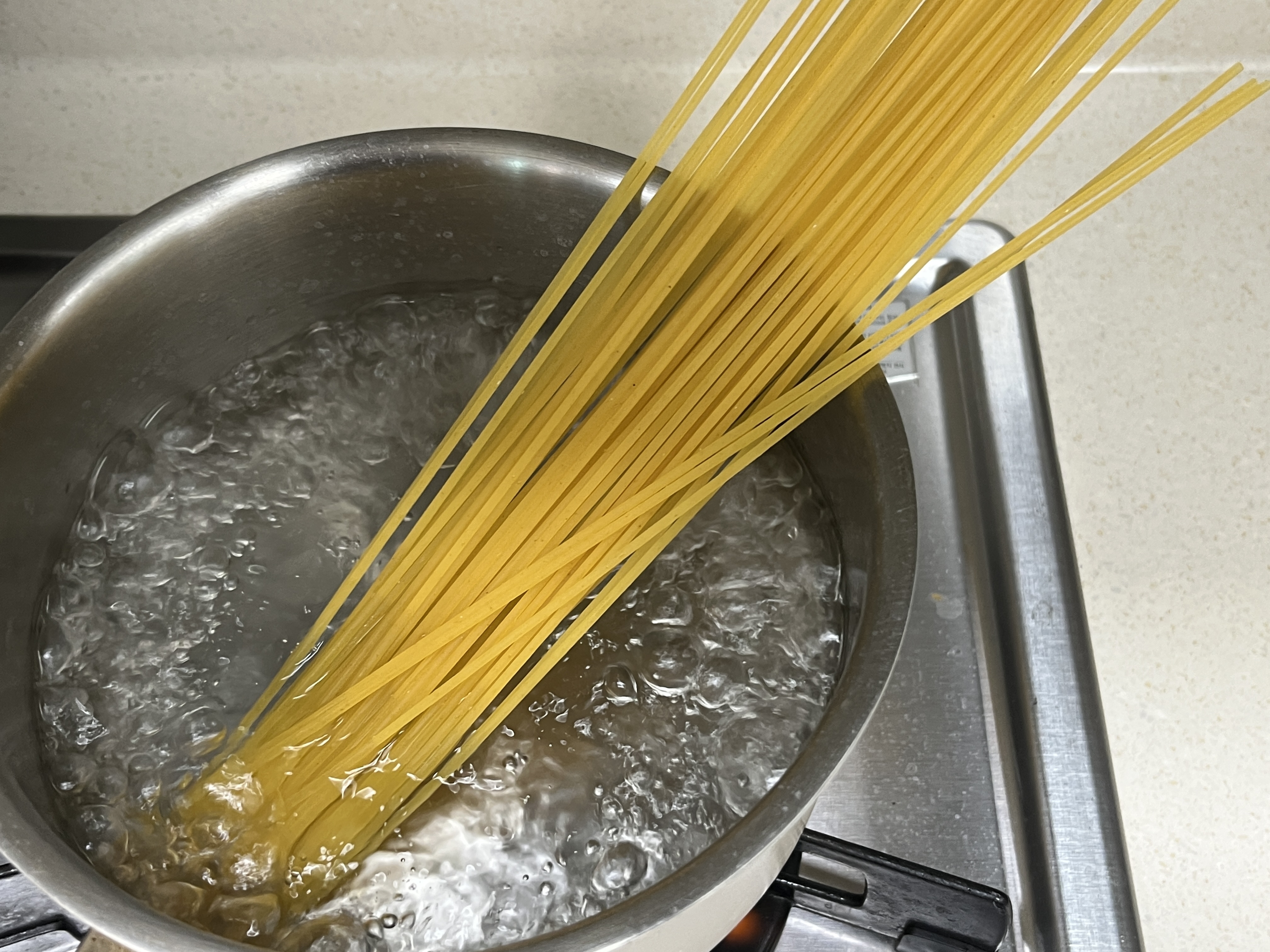 파스타 면을 삶는 중에 물이 끓어오르면 찬물을 부어 거품을 꺼뜨려 줍니다. 이 과정은 2~3 번 정도 반복하여 줍니다. 이렇게 삶으면 쫄깃한 면을 삶을 수 있습니다.