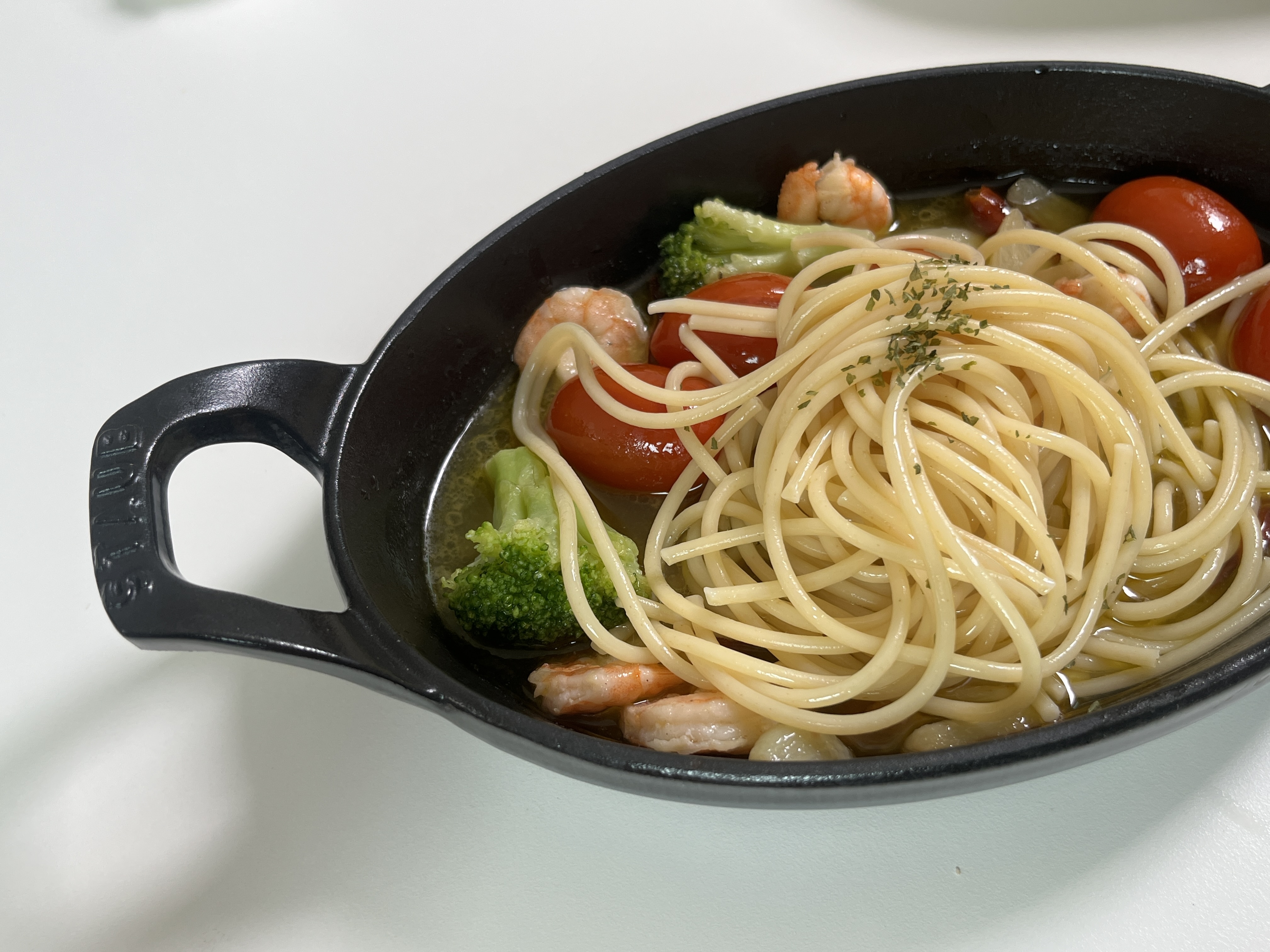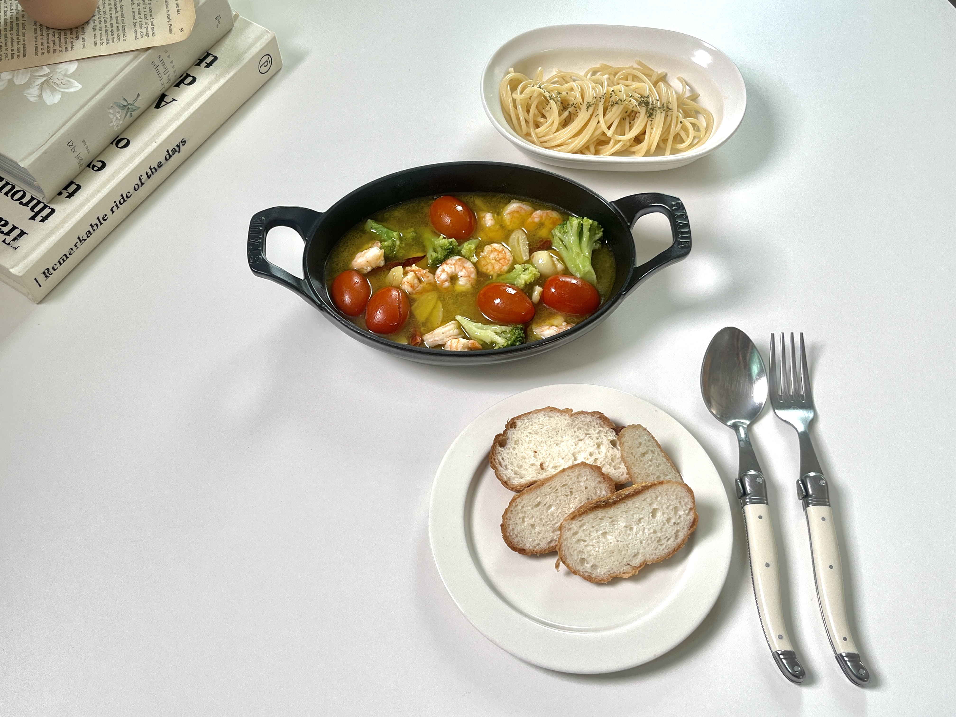 빵에만 먹으면 아쉬우니 파스타 면을 넣어 함께 먹으면 두 배로 더 맛있게 감바스를 즐길 수 있습니다.