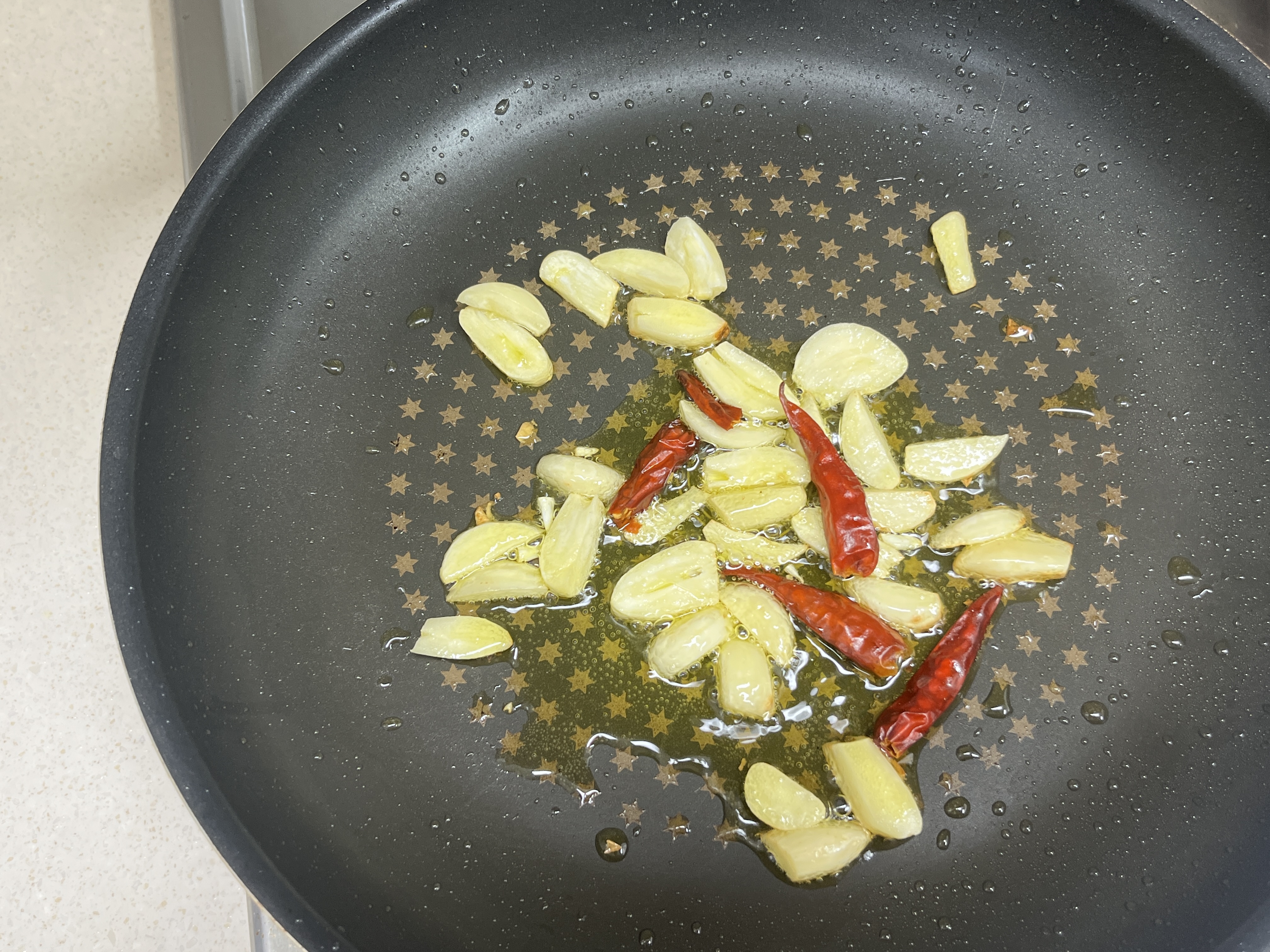 마늘을 볶다가 마늘의 향이 올라오면 페페론치노를 넣어 함께 볶아 줍니다. 더 매운맛을 내기 위해 페페론치노 1개는 반을 잘라서 볶아 주었습니다.